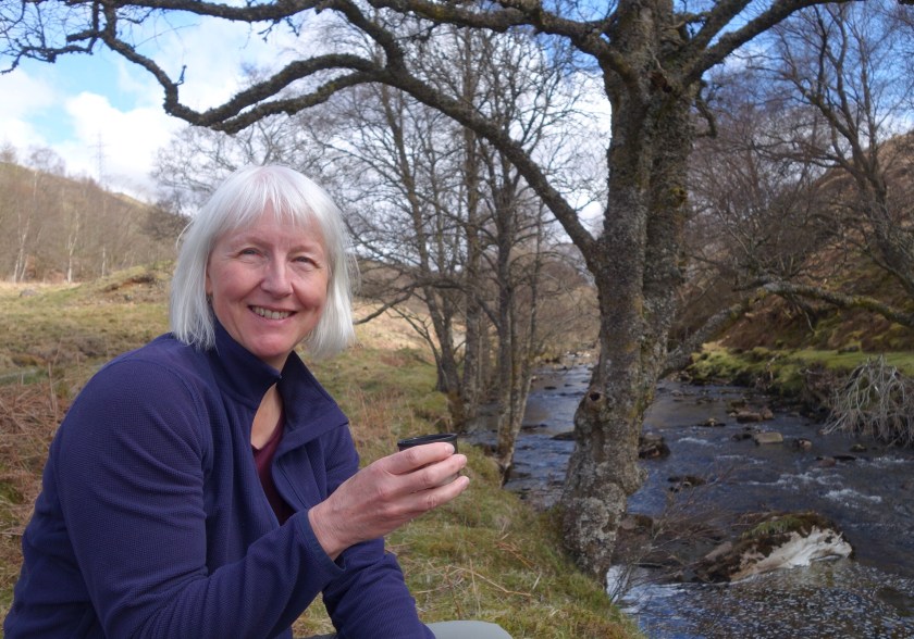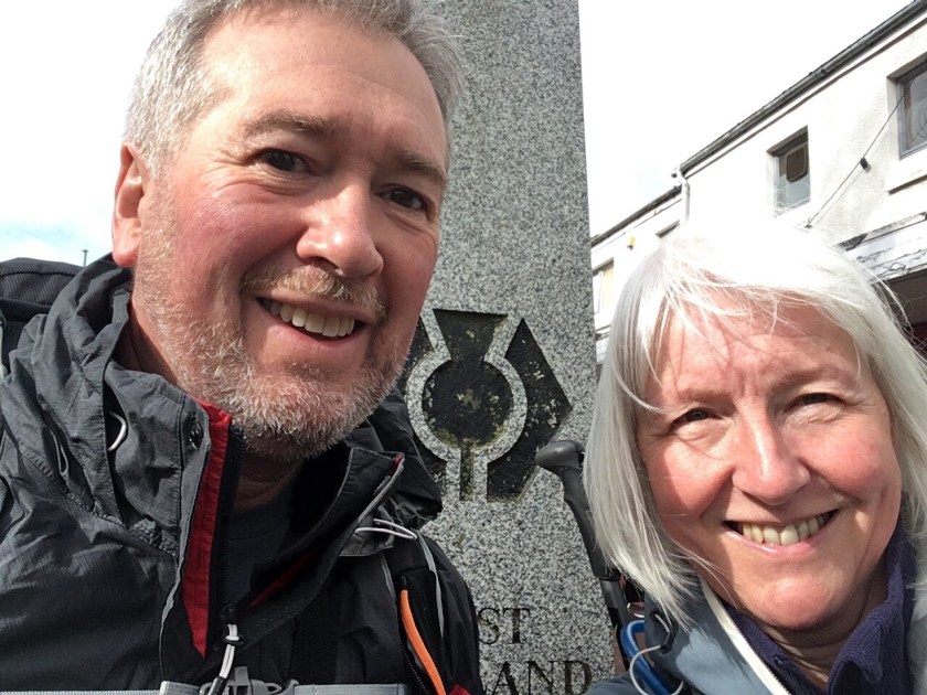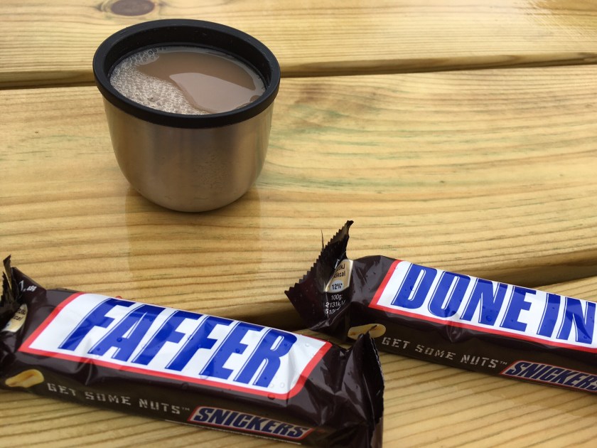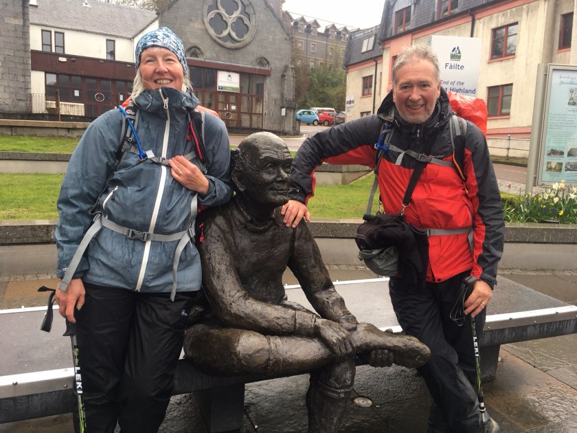 Around 11 the drizzle set in, and continued for the rest of the day. On the map the path ran through conifer forests, but most of the trees have been felled recently so we were exposed to the wind, and it was a bleak and uninviting landscape. Finally Ben Nevis appeared – we knew it must be around somewhere. After far more uphill stretches than we’d expected, we joined a forestry track which wound downhill and was soft underfoot, to join the road which we followed into Fort William, after a brief stop to enjoy today’s Snickers.